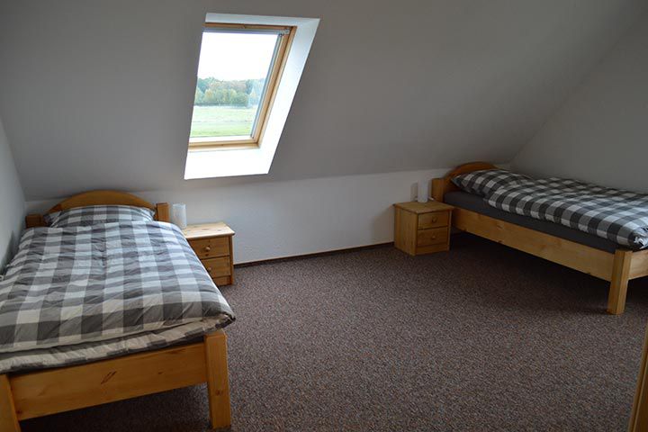 Auch hier verfügt das Schlafzimmer über 2 gemütliche Betten, 2 Schränke und 2 Nachttische. Der Blick über die weiten der Wiesen bis zum Wald lädt direkt zur Erholung nach dem Kurs ein und lässt einen erholsamen Schlaf ohne störende Nebengeräusche zu.